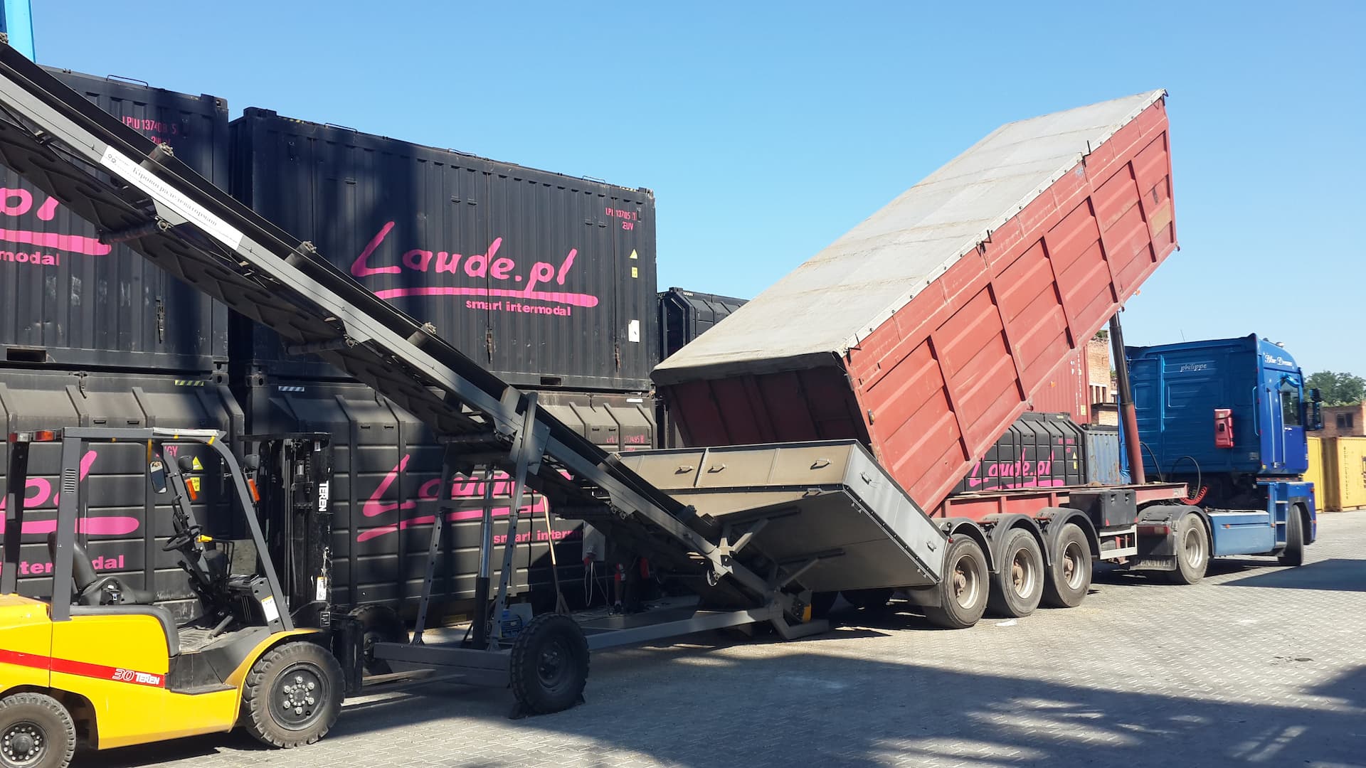 - Під час вивантаження сипучих зі складів напольного зберігання відбувається те ж саме. Навантажувач «Буржуй» встановлюють на виїзді зі складу. Автотранспорт бортовий або з контейнерами маневрує на вулиці, а фронтальний навантажувач, рухаючись виключно всередині складу, оперативно доставляє вантаж до бункера, встановленого на «Буржуй». При цьому істотно скорочується не тільки час навантаження, але і присутня економія на експлуатації самого фронтального навантажувача – менше пробіг, в щадному режимі працює гідравліка, т. я. немає необхідності піднімати вантаж на велику висоту. Знову ж таки, не потрапляє зайва волога у вигляді дощу або снігу за колесами в склад, а, відповідно, і в продукт, який зберігається в цьому складі.